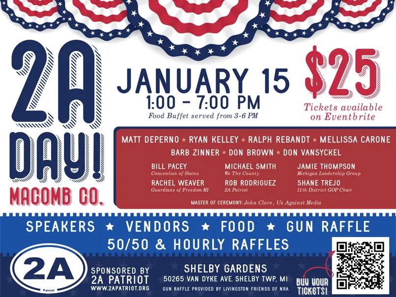 Spend a day with 2A Patriot, meeting the public servants in Michigan and learn how YOU can protect your 2nd amendment rights! Master of Ceremonies is John Clore from Us Against Media. Speakers are Matt DePerno, Ryan Kelley, Ralph Rebandt, Bob Scott, Barb Zinner, Don Brown, Don Vansyckel and many more! We will have many vendors at this event – USCCA, Guardians of Freedom, We the County, Convention of States, Michigan Leadership Group and more. We’re going to have a 50/50 raffle, great food, and lots of info as to how YOU can make a difference!