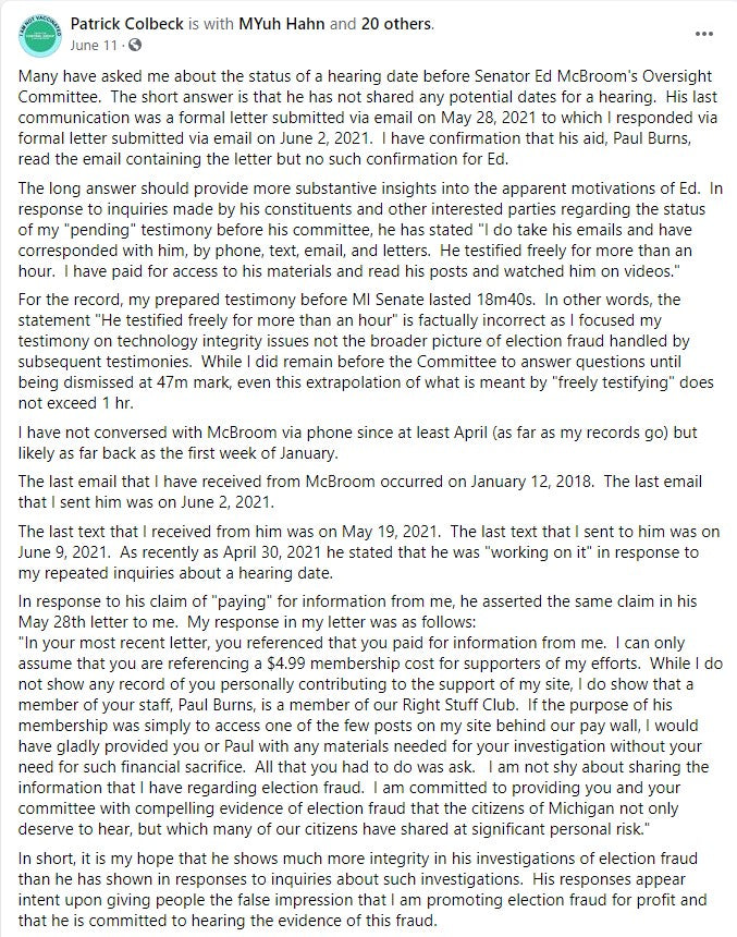 McBroom is trying to weaponize the AG against people who he doesn’t like and/or those who believe the election was stolen. He didn’t provide any footnotes in his report, but expects us all to feel the same way he does, and we’re not allowed to say anything on the contrary. On top of that, the report does not state with proof that Matt Deperno, Patrick Colbeck, Dr. Frank, or anyone else, did this for personal gain.