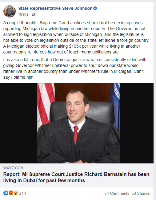 Yesterday, Representative Steve Johnson called out Supreme Court Justice Richard Bernstein for deciding cases while in another country!