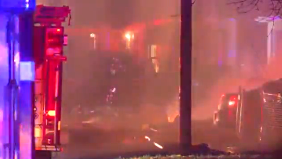 Search dogs were brought to the scene Monday night in Flint, Michigan, in response to a huge blaze that witnesses claim was accompanied by several explosions.